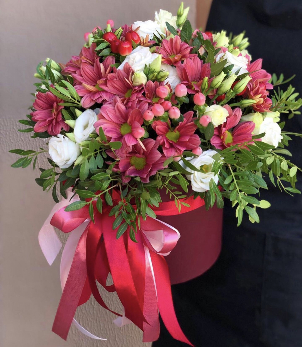 Состав: Хризантема (4), Эустома (4), Гиперикум (5), Писташ (4), Коробка, Оазис (1)